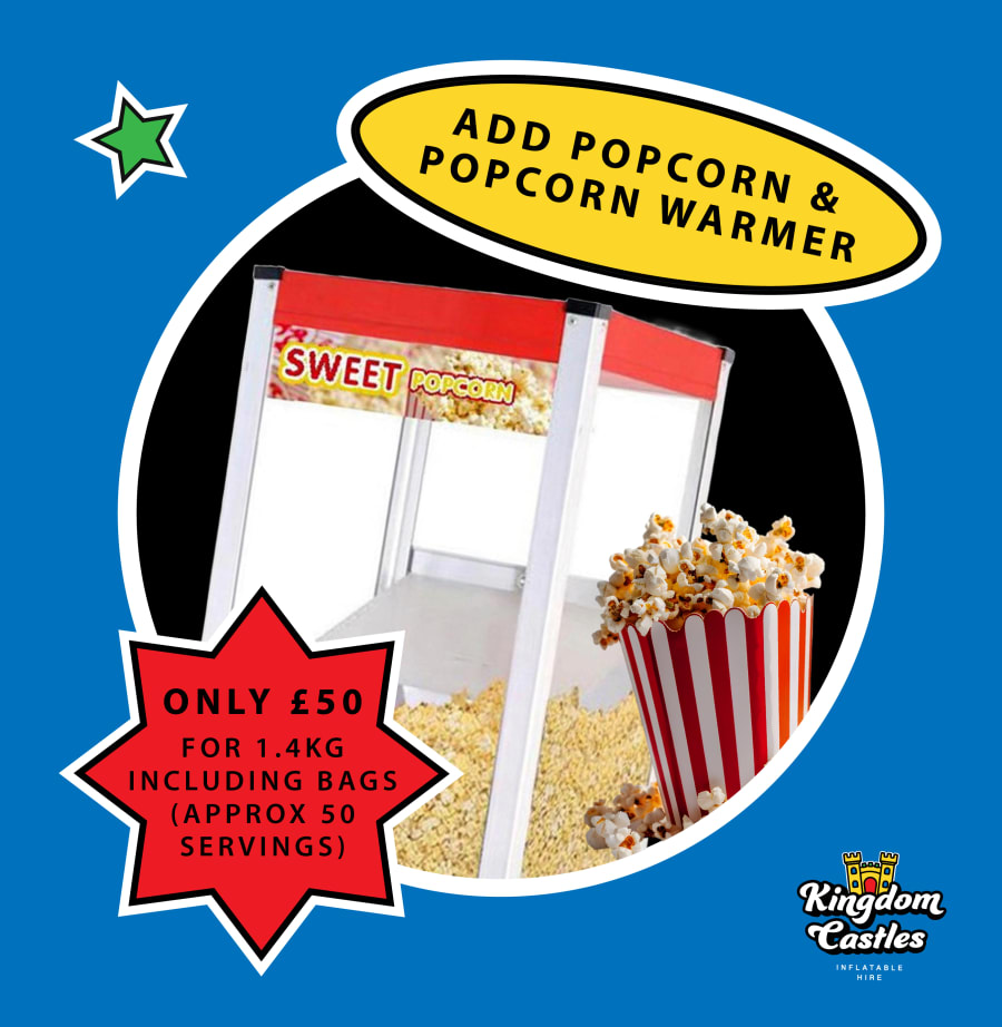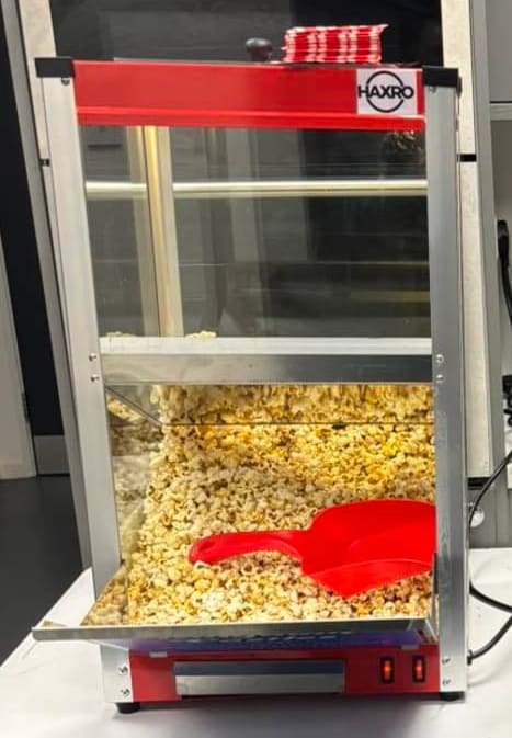 Our Popcorn Warmer rental includes 50 portions of delicious, freshly popped popcorn, 50 popcorn bags, and a handy popcorn scoop.